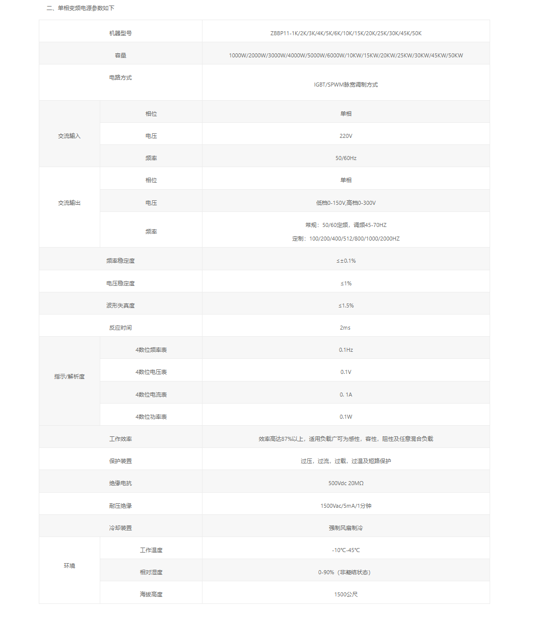 - 技术与性能:ZBP 系列单相变频电源运用数字分频、D/A 转换、瞬时值反馈等技术,单机容量可达 500kVA ,借变压器输出增强整机稳定性;具备负载适应性强、输出波形质量好、操作简便、体积小、重量轻等特点 。